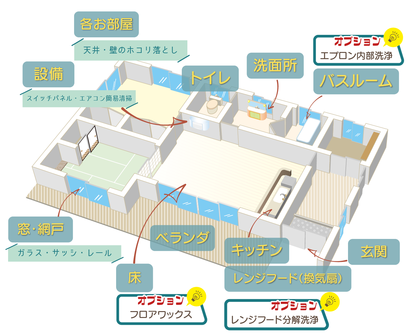 天井・換気扇カバー・壁・シャワー掛け・シャワー本体・水栓・鏡・エプロンカバー・浴槽・フタ・温度調節機・扉・床・排水溝・窓 ※オプションサービス:エプロン内部洗浄 【キャンペーン対象】 |