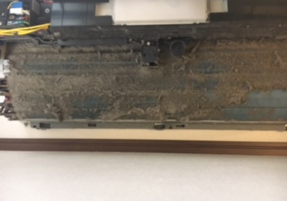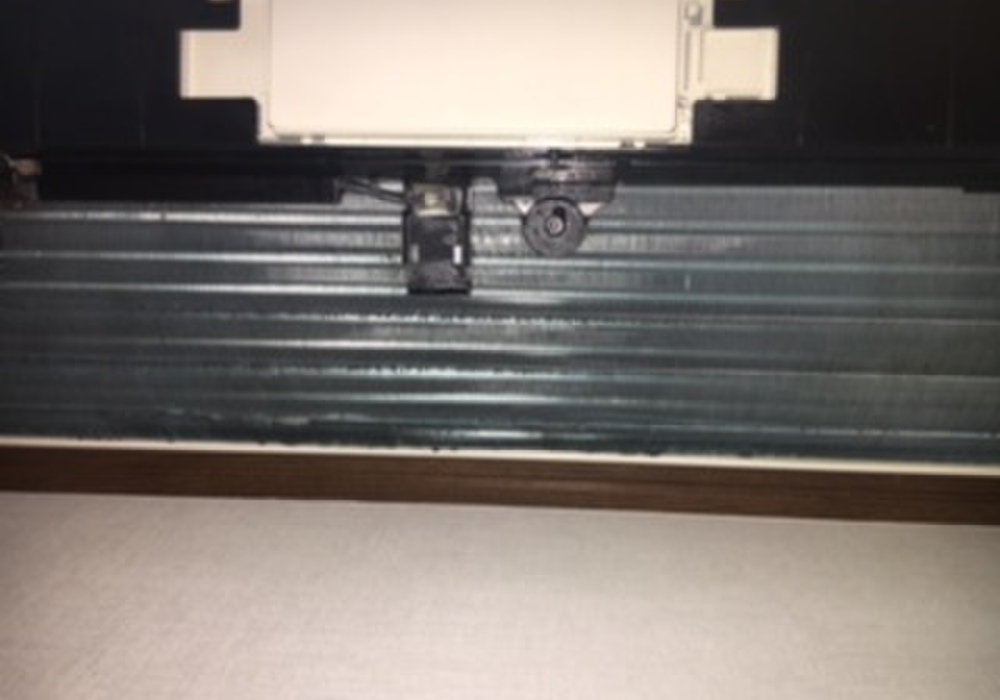 カバーを外すと、ホコリやカビがびっしり!!このエアコンから風が出ていたと思うとゾッとしますね…!!